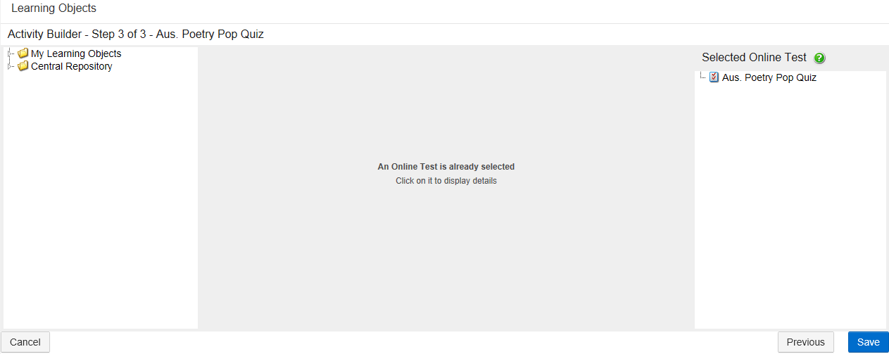 Browse through the Learning Object Repository to locate the Online Test you would like to attach to your Activity.