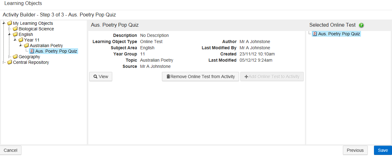 Save this Activity and return to the Learning Objects screen | Once your Activity has been saved, you will be redirected to the 'Learning Objects' screen. The Activity that you have just created will be selected in the Learning Object Repository. |