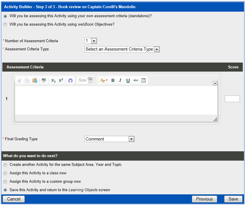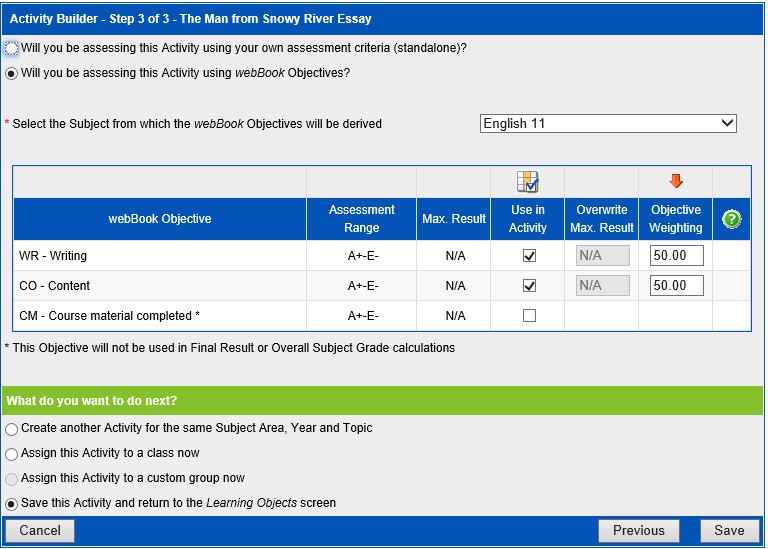 To use Assessment Criteria Objectives as your marking criteria, select the option 'Will you be assessing this Activity using webBook Objectives?'