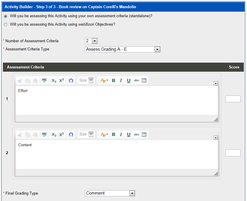 To create your own marking criteria, select the option 'Will you be assessing this Activity using your own assessment criteria (standalone)?'