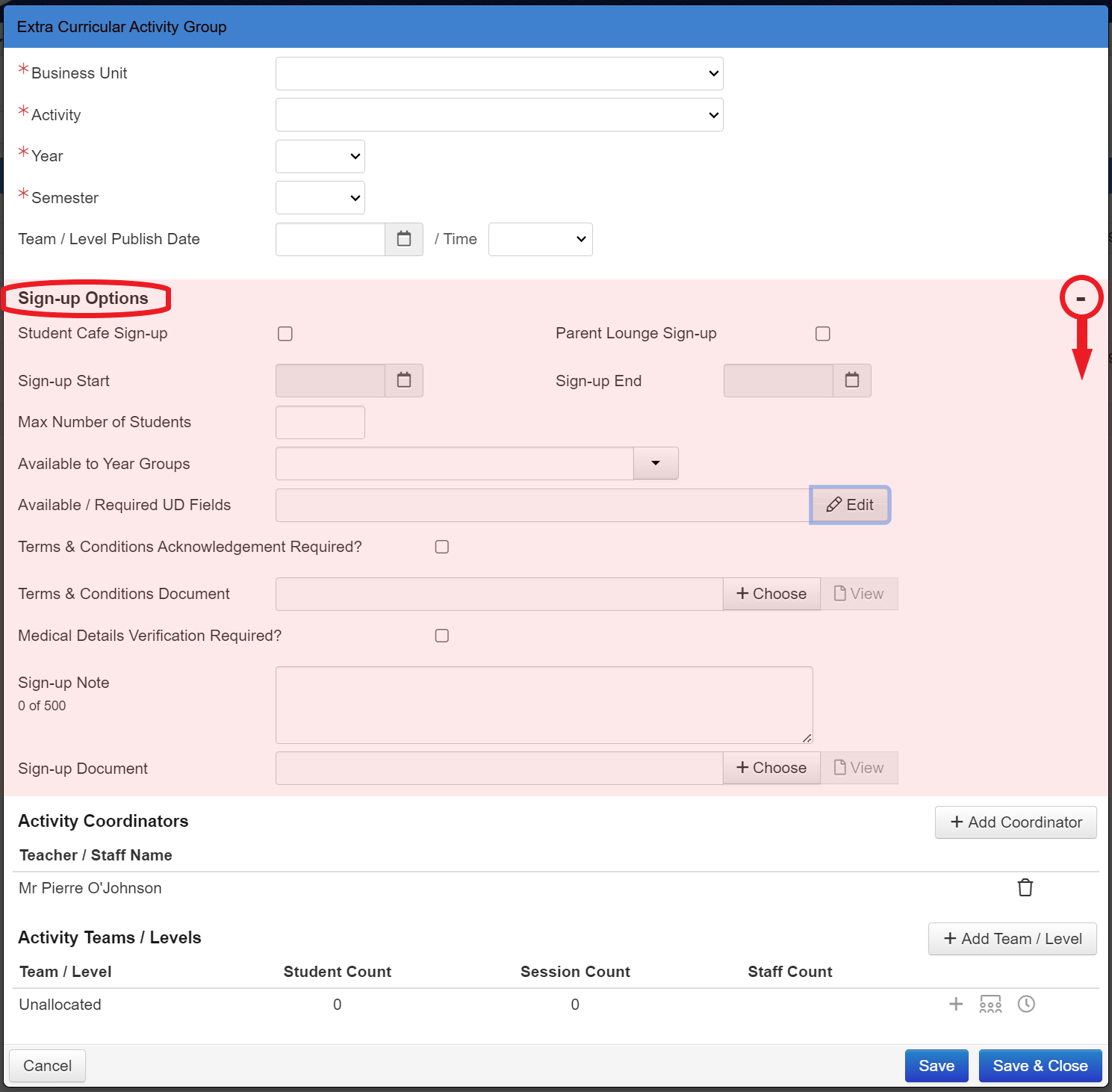 Click on the 'Sign-Up Options' heading or use the '+' and '-' icons to expand/collapse the screen and view the 'Sign-up Option' fields.