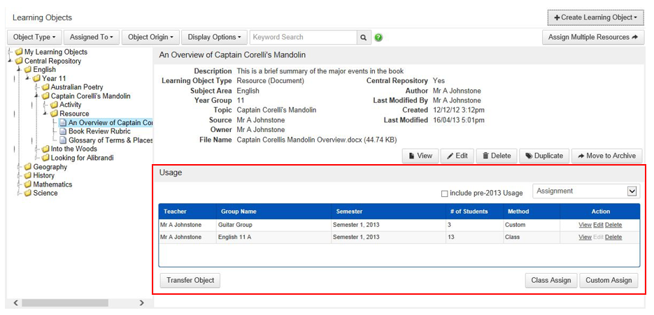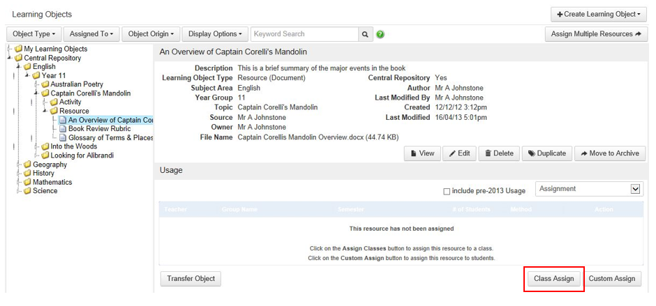 Click this button on the 'Learning Objects' screen to assign this Resource to one or more subject classes.