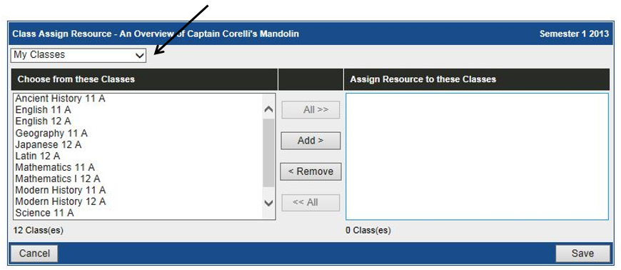 Highlight the class(es) that you want to assign this Resource to, in the 'Choose from these Classes' column and move them to the 'Assign Resource to these Classes' column.