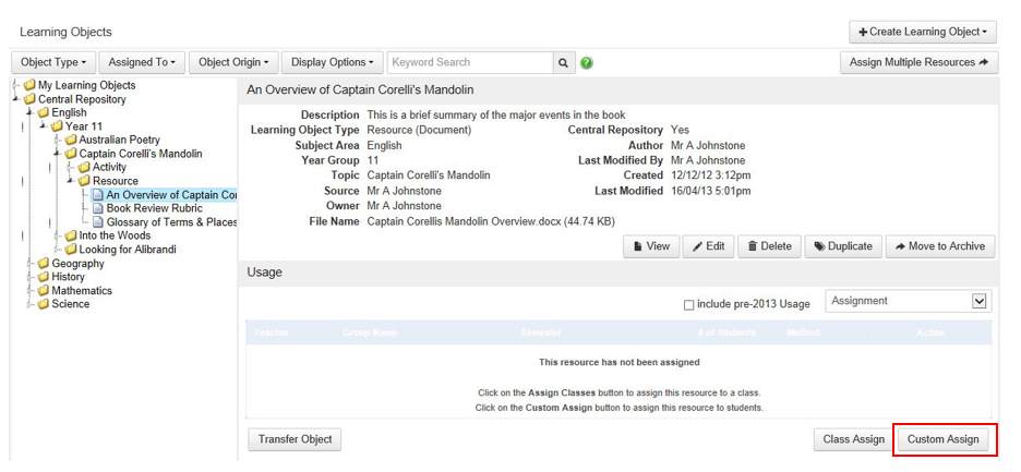 Click this button on the 'Learning Objects' screen to assign this Resource to a custom group of students.