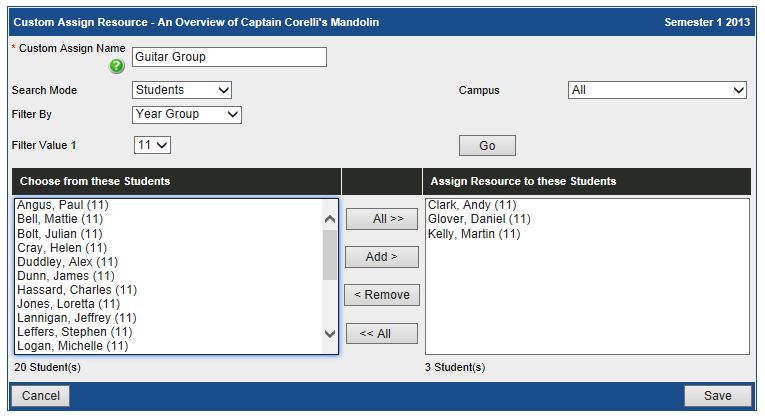 Highlight the students who you want to assign this Resource to and move them to the 'Assign Resource to these Students' column.