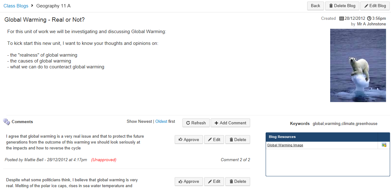 Click the 'Delete Blog' button to delete the blog. Any comments made by students will also be removed.