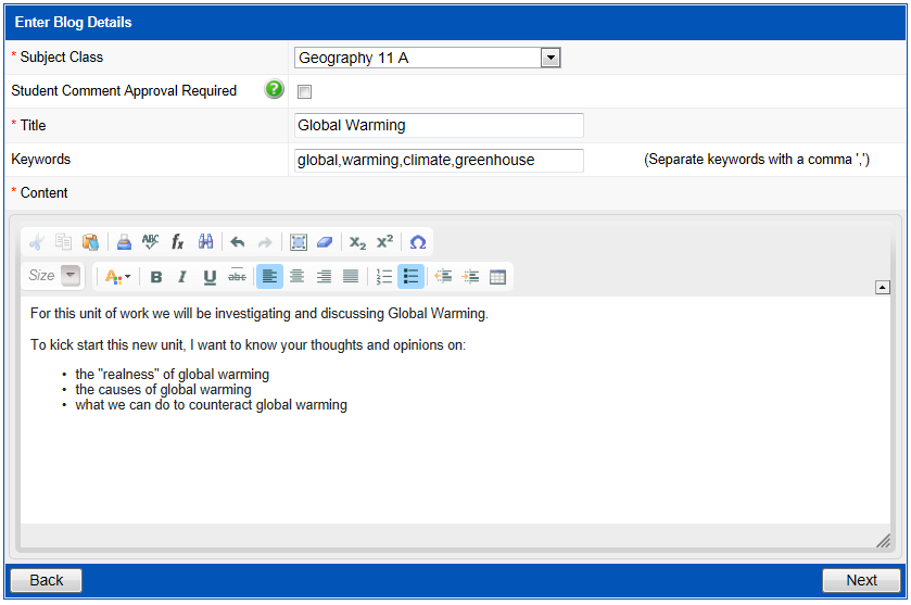 Subject Class | This field will display a list of your subject classes for the current year and semester (or term). Select the subject class you want to create this blog for. Each student within the subject class you select here will be able to access and participate in the blog through Student Café. |