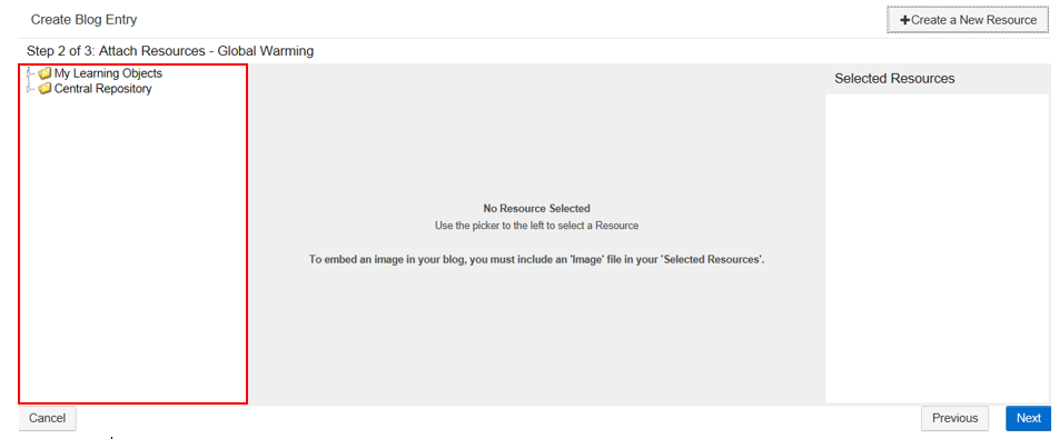 Browse through the Learning Object Repository to locate the Resource(s) you would like to attach to your blog.