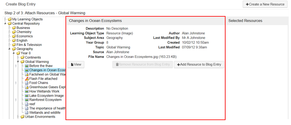 Resources that have been added to the blog will be displayed in the 'Selected Resources' column.