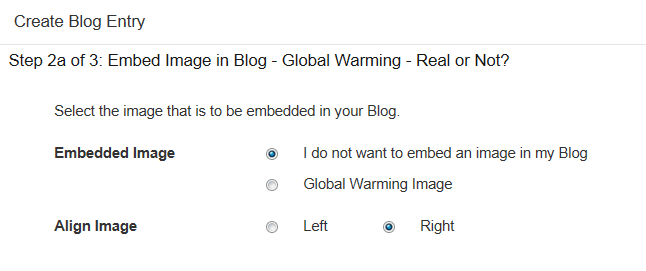 Embedded Image | Check the 'I do not want to embed an image in my blog' radio button if you do not want an image displayed alongside your blog content. Alternatively, check the Resource image you want to display. If you selected multiple Resources that contained image files in Step 2, they will be displayed here. You can only embed one in the blog content. All Resources will still be available to the students in the blog resources panel. |