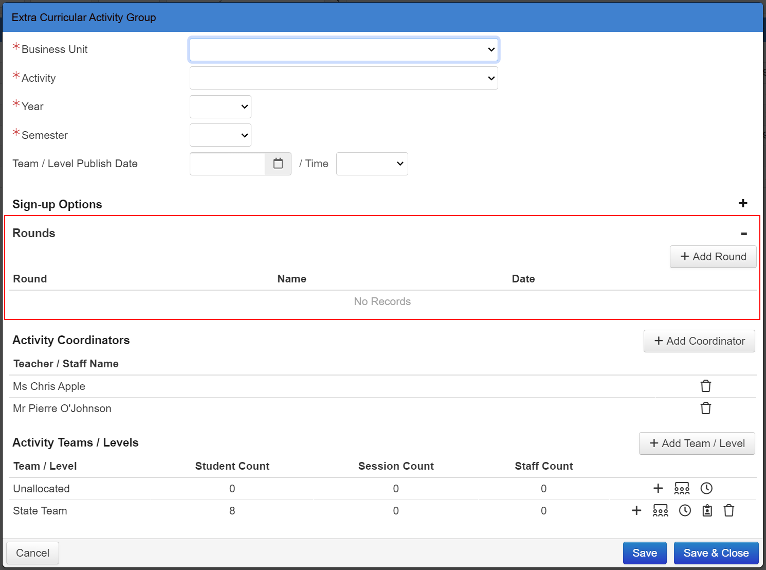 This section of the screen will only be displayed once the initial Extra Curricular Group record has been saved. Edit the EC Activity Group and click on the 'Rounds' heading or use the '+' and '-' icons to expand/collapse the screen and view the 'Rounds' fields.