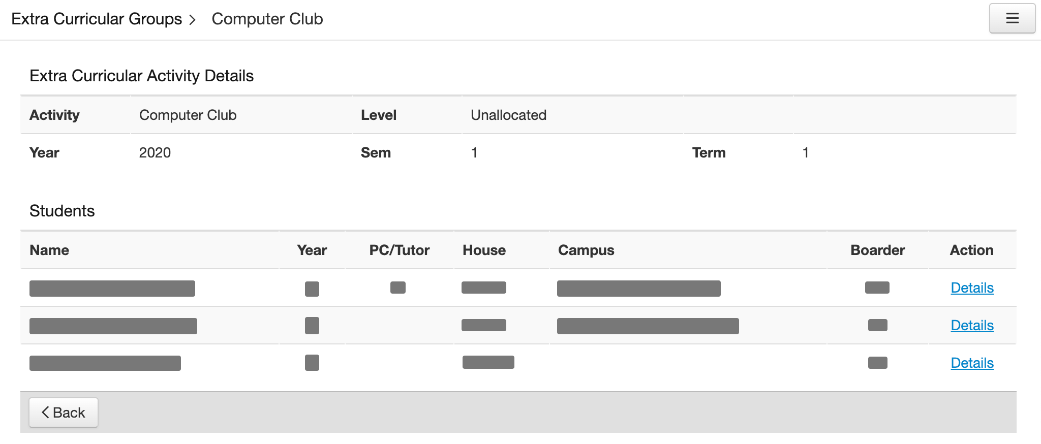 Select the 'magnifying glass' icon in the 'Action' column to display a list of students allocated to an Extra Curricular (EC) Group.