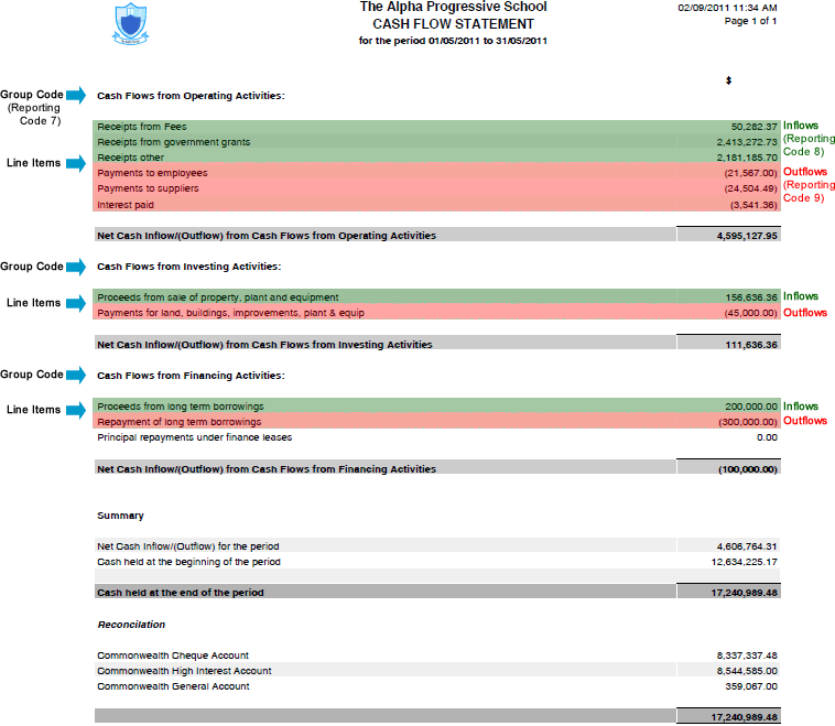 Refer to the example below of a Cash Flow Statement and the related use of Reporting Codes.