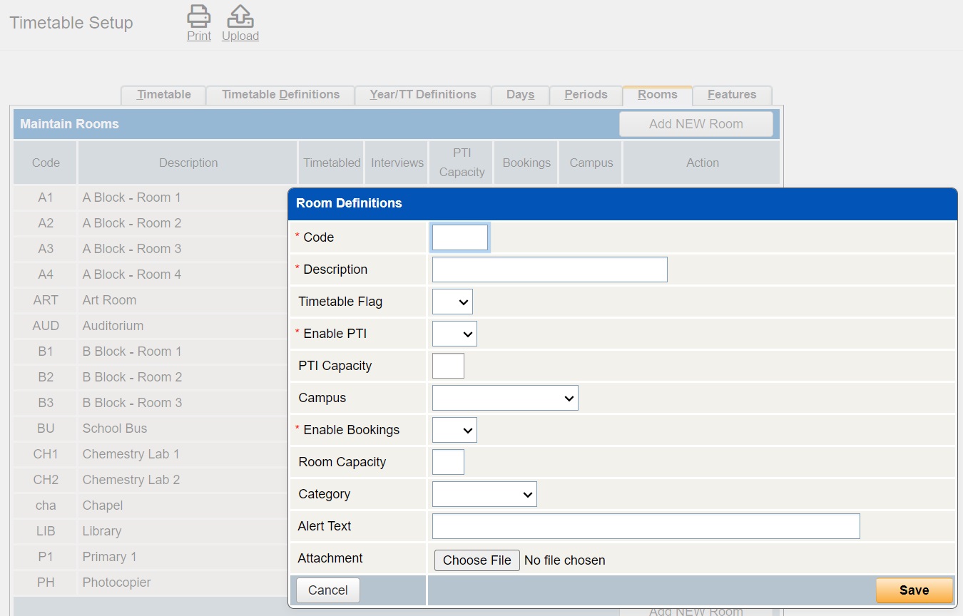 6 | TASS.web Student Admin > Timetable > Setup Information > Timetable Setup on the 'Rooms' tab. Check/Add Room details. ![]() | Rooms > Room data Room data can be downloaded from TASS into TES Timetable. The 'Admin ID' takes precedence during a sync where there is both a Room Code and an AdminID in TES Timetable. Rooms do not sync from TES Timetable and must be set up in TASS. | 🔲 |