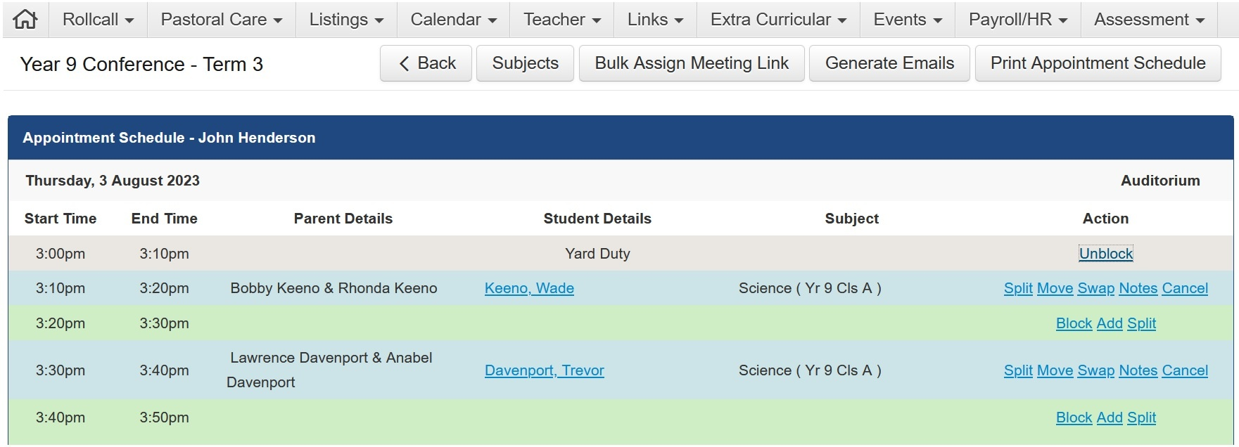 Split | Select ‘Split’ to split this appointment into two. For example, you may be oversubscribed and decide to split an appointment slot into two to see more parents. If the appointments were 10 minutes long, you could split them into two 5-minute appointments. Appointments shorter than the specified 'Minimum Appointment Length' for this conference cannot be split. Additionally, you cannot split an appointment with an odd duration, as it cannot be evenly divided. You can also reverse this process for this appointment by clicking the 'Join' link from the 'Appointment Schedule' screen. | ||||||