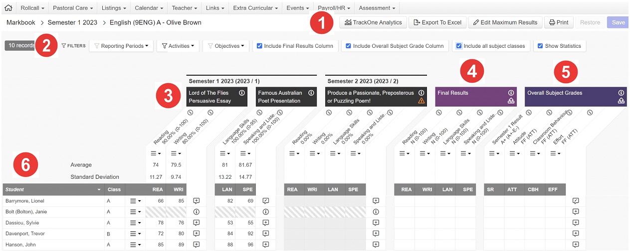 TrackOne Analytics | When TrackOne integration has been set up and flagged to display in Markbook, the TrackOne analytics button takes the user to the class's continuous assessment results screen in TrackOne. |