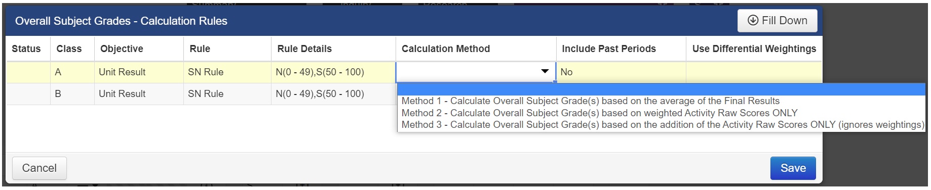 Use the ‘Calculation Method’ column to select the appropriate Calculation Method that you want to use for the Overall Subject Grade calculation.