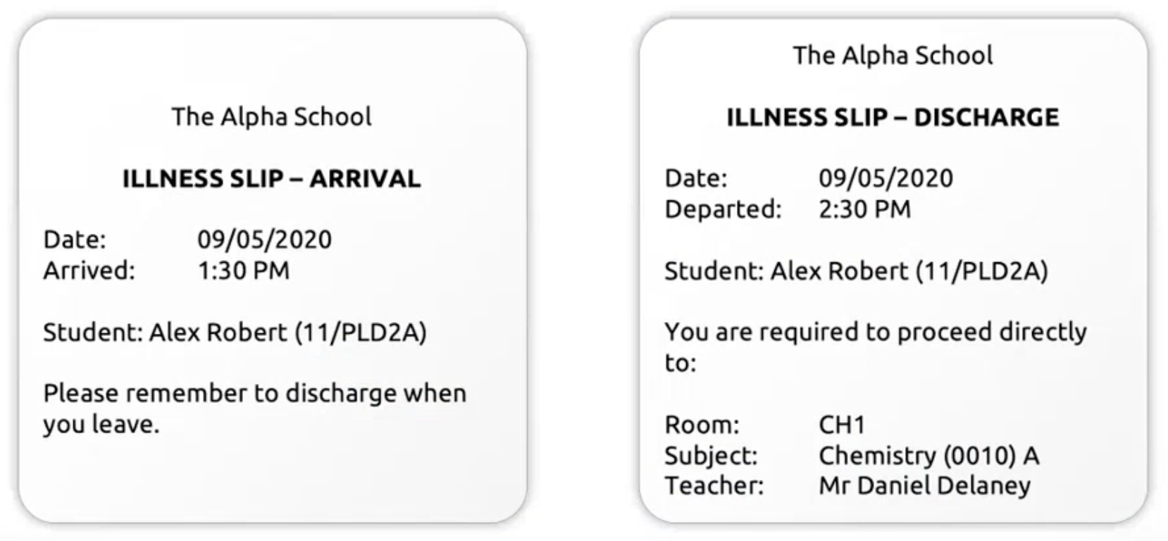 Tapping 'Discharge Now' will generate a discharge slip (with a timestamp)—it will also have the student's next class printed on it.