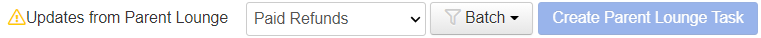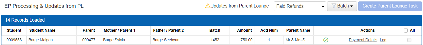 Records with greyed out checkboxes will relate to records where Parent Lounge tasks have already been created (Orange tick), payment details are already present (Green tick) or the parent address has no email address defined (Red error).