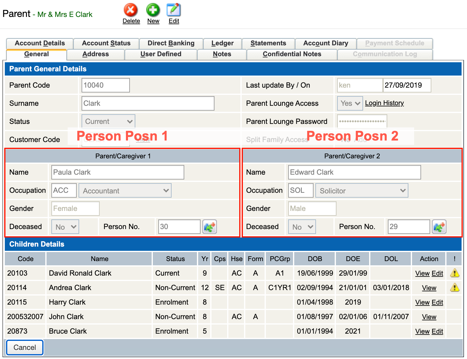 Person Position | This field is used to let the system know to which 'Person' on the parent record this address block will be linked. In the screenshot below 'Person Position 1' is labelled as 'Parent/Caregiver 1' and 'Person Position 2' is labelled as 'Parent/Caregiver 2'. ![]() ![]() |