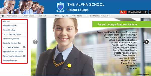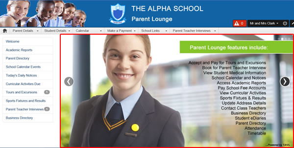 For further information, refer to the section on 'Parent Lounge' in TASS.web System Admin > Utilities > Product UI Maintenance.