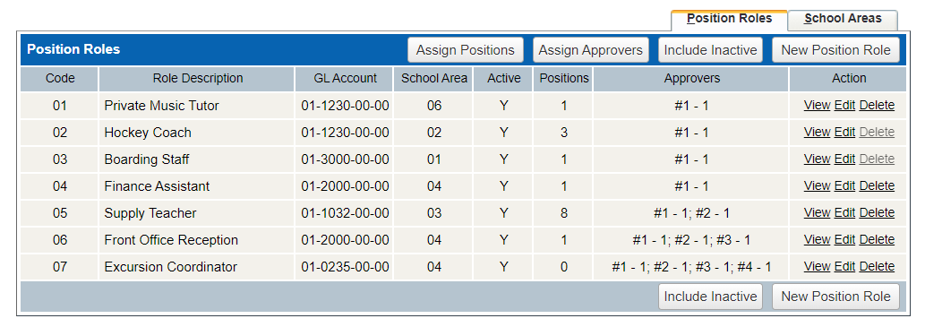 The ‘Position Roles’ program is used to define and map the different types of employee roles to positions at a school, e.g. Supply teachers, coaches and tutors and Office Administration staff that work at the school on a casual basis.