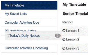The ‘My Timetable’ section provides information about daily room changes and teacher substitutions for the selected day. Click ‘Full Timetable’ to view the master timetable.