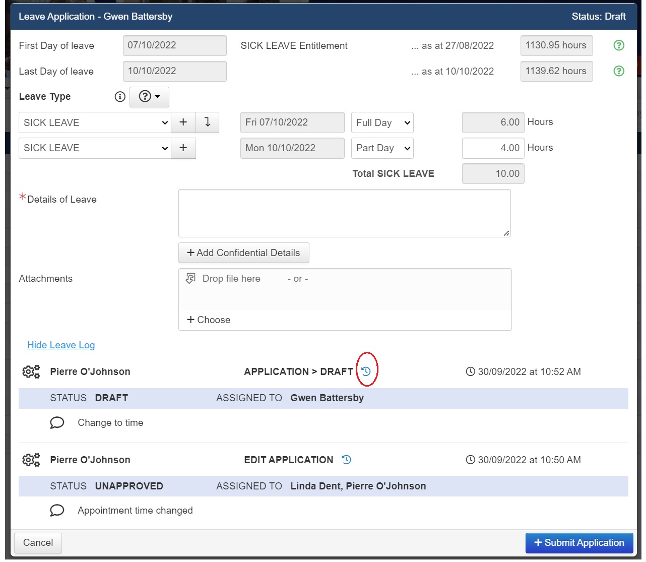 Staff Kiosk | Leave Applications in Staff Kiosk now record further details of changes made to an application. A new 'Change Log' icon displays within a submitted Leave Application, and when clicked, opens a pop up screen that displays the details of the change, including when an application is added, edited or approved. |