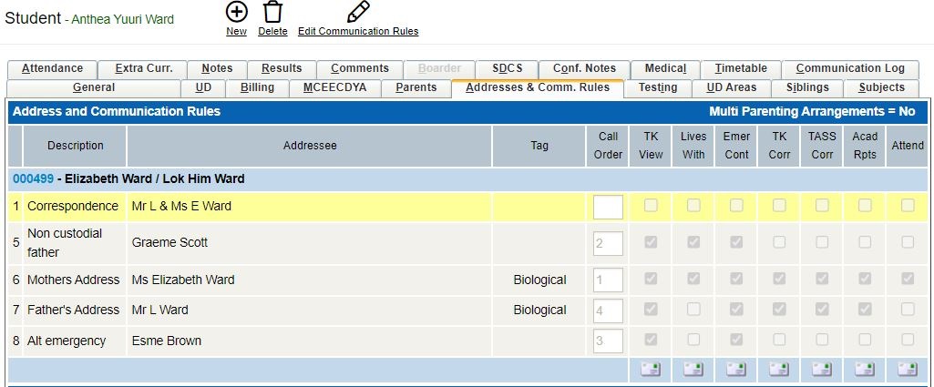 Call Order for Communication | Parents/Caregivers can now be assigned a 'Call Order' in the 'Addresses and Comm Rules' tab in a student's record.