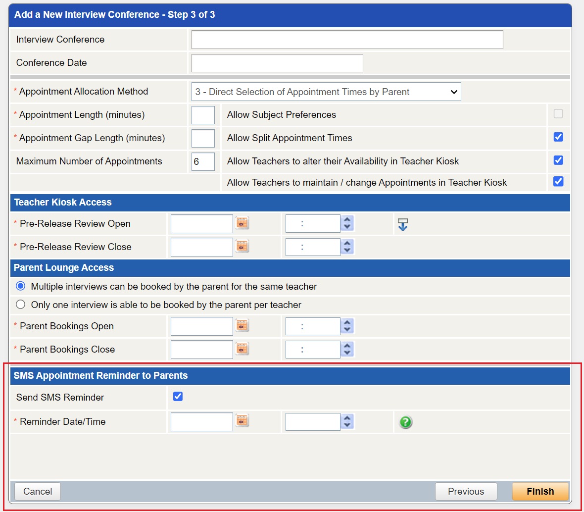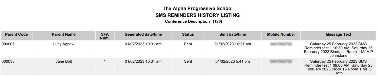 Parent Teacher Interviews - SMS Reminders | Parents and Guardians who have made Parent Teacher Interview bookings can now be sent a reminder SMS prior to a Conference. This should be a great help to busy parents and should assist in keeping conferences running on time. Note that an SMS Gateway API must be set up to use SMS functionality. |