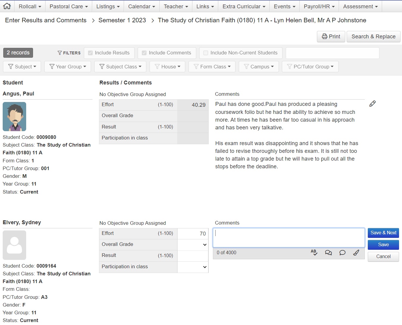 Staff Kiosk > Assessment | Enter Results and Comments | 'Search and Replace' functionality is included in the new 'Enter Results and Comments' program, allowing users to easily find and replace text from within previously entered comments. | MIS01 | TASS-466 |